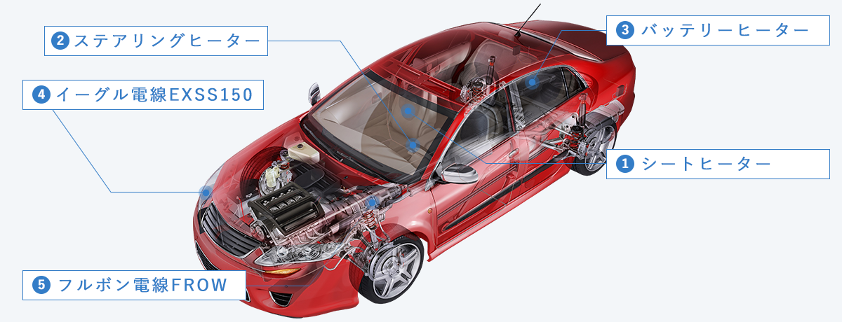 - 例) LEDヘッドランプ内のリード線、レゾルバのリード線、エンジン周りのリード線等。